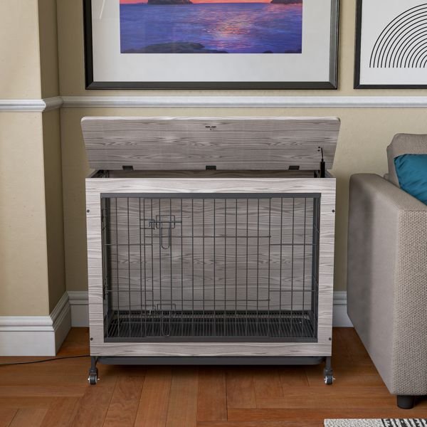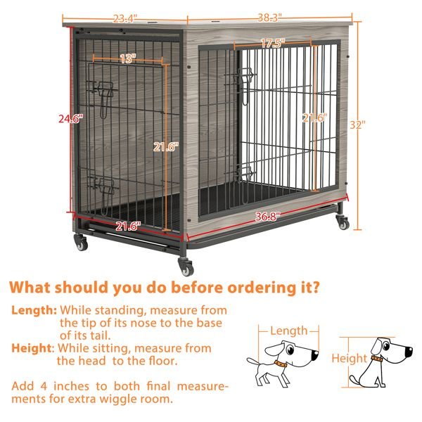 Style meets function with this versatile wooden indoor kennel that serves as a secure space for your pet as well as a practical piece of furniture that easily blends with your interior design. This heavy-duty dog crate is conveniently on rolling casters to be able to move to any room in the house. Dog cage three generously sized entry points including a wide double-door, single side-door, and horizontal lift-top provide easy accessibility. The pet crate two front-facing doors are equipped with premium latches to securely shut closed. Pet cage high-quality iron bars enclose the open-air design to allow for proper ventilation and 360 degree visibility. Give your pet a safe place to rest that doesn't obstruct your room decor thanks to this furniture-style dog pen!