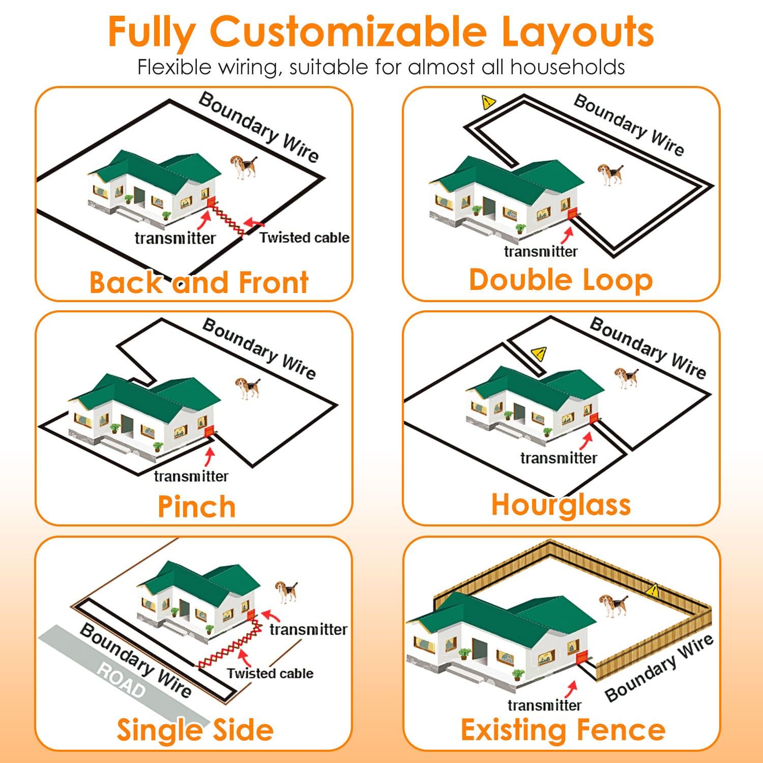 *Efficient Dog Fencing System*:The transmitter,receiver and boundary wire forms an effective fencing system together to deter our dogs from the designated area,which greatly ensures our pets’ safety. The boundary wire creates an effective signal field when the transmitter is working. If your dog tends to walk out of the boundary,the transmitter will emit a harmless radio signal. Once the signal is detected by the receiver,it will automatically start warning beep,vibration or static shock to urge your dog to go back into the boundary.